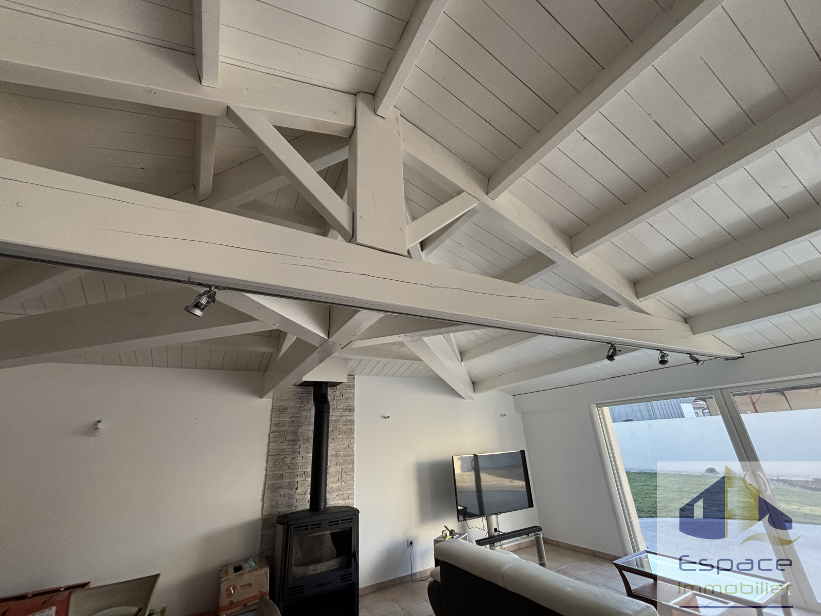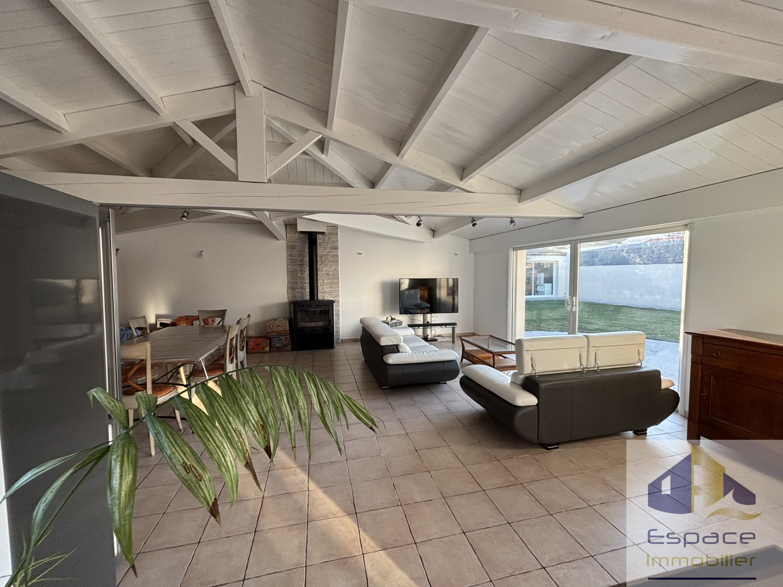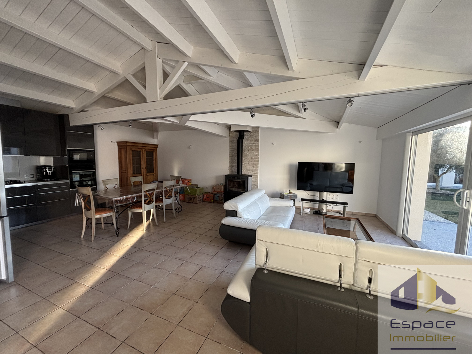 La maison principale se compose d'une spacieuse et lumineuse pièce de vie avec poutres apparentes, cuisine équipée, poêle à bois, ouvrant sur un agréable patio et sur le jardin avec sa baie à galandage.